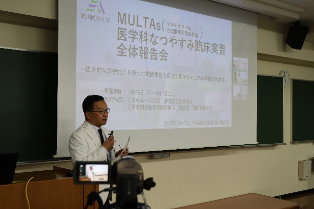 令和7年10月7日(火)、旭川医科大学第4講義室およびZoomを併用し、「なつやすみ臨床実習全体報告会」を開催しました。会場には学生や教職員が参加し、Zoomでは実地指導者の皆様にもご参加いただきました。