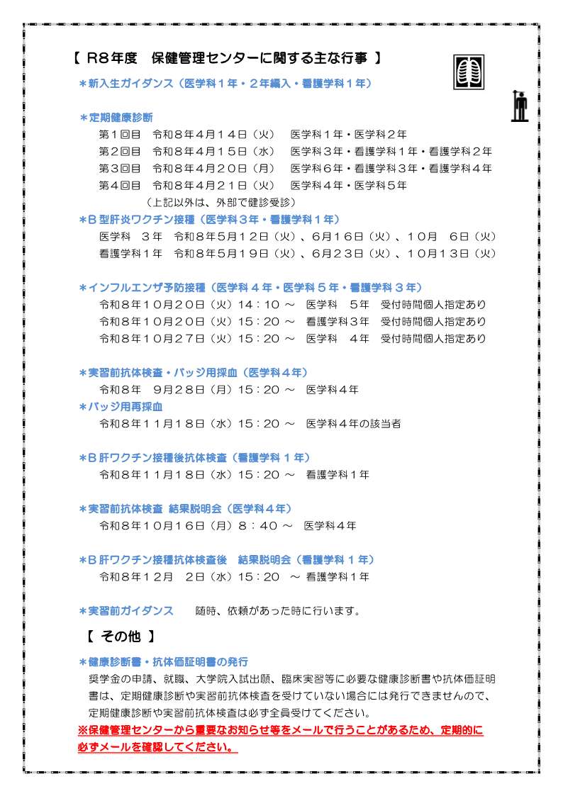 - 感染対策ガイダンス:各学年の実習前に公欠制度の説明や自己健康管理について啓発